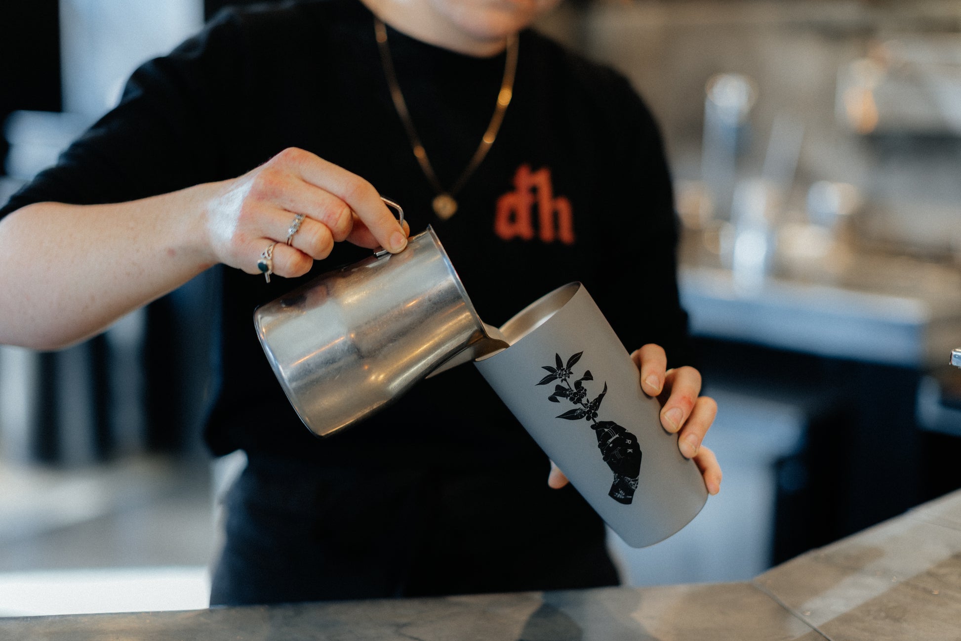 "dh" pocket logo on front with the vintage Dark Heart Coffee logo printed on the back of Royal Apparel long sleeve 100% organic cotton tee